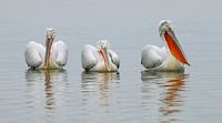 Een drietal zwemmende Kroeskoppelikanen, in frontaal aanzicht en in horizontaal formaat, gefotografeerd op Kerkinimeer in het noorden van Griekenland vlakbij de grens met Bulgarije.