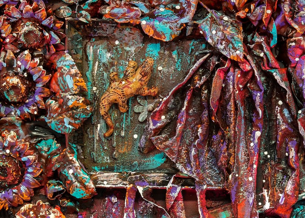 Dit kunstwerk is ontworpen en gemaakt door kunstenares Christel De Buyser en 3D en bloemen liggen letterlijk op het doek. Het originele kunstwerk is ook nog beschikbaar.