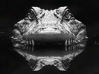 Een close up zwart-witfoto van een krokodil, met enkel zijn kop boven het wateroppervlak. De achtergrond is volledig zwart, wat de focus op de scherpe, glanzende ogen en de ruwe textuur van de bek versterkt.