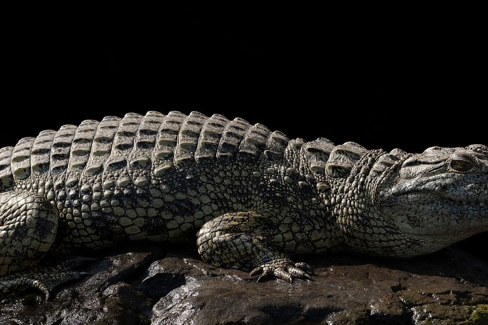 Krokodil neemt zonnebad. Zwarte achtergrond. Natuur. Wildlife. Botswana. Mooie achtergrondfoto