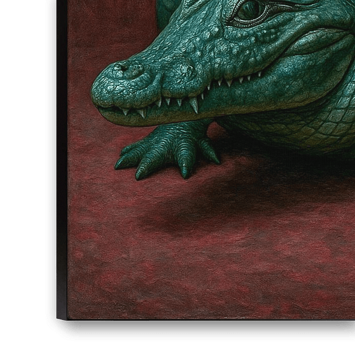 Deze stijlvolle illustratie van een tas in krokodillenvorm is een echte blikvanger. Het speelse ontwerp combineert mode en fantasie waardoor het kunstwerk direct opvalt aan de muur. De verfijnde details en zachte tinten geven de tas een luxe uitstraling terwijl de krokodilvorm een humoristisch en creatief accent toevoegt.
