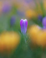 Macro fotografie van een crocus op een mooi voorjaars veldje van gele en paarse krokussen. Ik heb een 70-200mm telezoom lens gebruikt waarbij je bij een groot diafragma een kleine scherpte diepte hebt. Dit creëert een mooi bokeh.