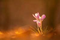 Krokusse zum Sonnenuntergang im Gegenlicht.