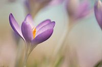Blooming purple crocus flowers in a soft focus on a sunny spring day