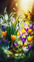 De eerste lentebloemen kondigen de komst van de lente aan. Een kleurrijke compositie van krokussen en sneeuwklokjes, nog bedekt met ochtenddauw, in het licht van de ochtendzon.
