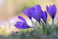 Prachtige paarse krokussen genomen in de schaduw. Op de achtergrond maakt de zon het beeld warm geel en steekt het paars mooi af.