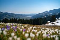 Krokusweide boven de Hündlekopf met uitzicht op de Alpsee in het voorjaar in de Allgäuer Alpen