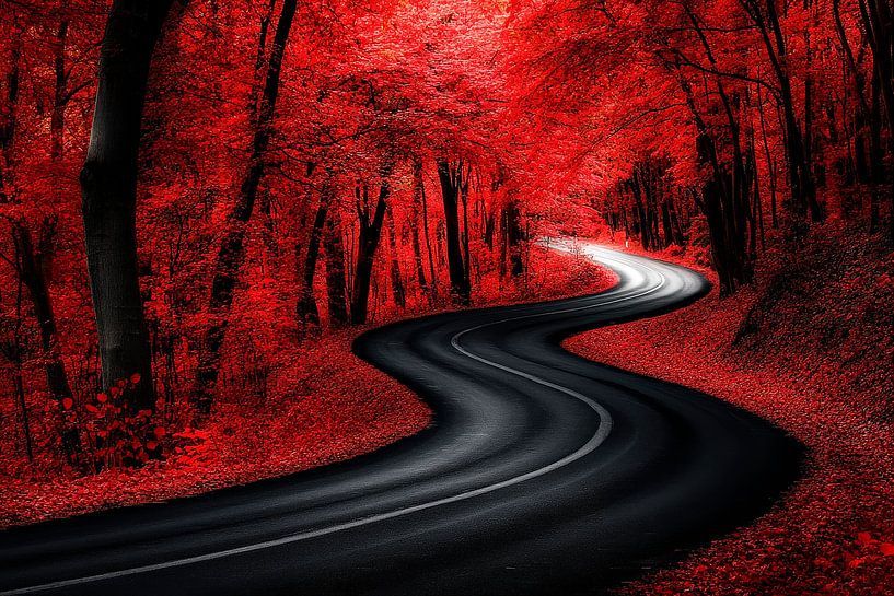Een kronkelende weg omringd door felrode bomen nodigt je uit voor een mysterieus avontuur. De schitterende kleuren creëren een dromerige, bijna magische sfeer, ideaal voor de woonkamer. Hier wordt elke blik een moment van ontspanning en inspiratie als de kijker wordt ondergedompeld in de zachte rondingen van het landschap.