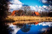Uitzicht op de Kromme Aar in Alphen aan den Rijn, met spiegelingen van woningen en het gemaal in het water.