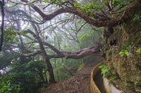 Kromme bomen in een prachtig groen bos op Madeira, Portugal. Foto is gemaakt op een mistige dag langs Levada do Furado.