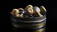 Deze horloge kronen zijn gevonden in een fournituren verzameling van een horlogemaker. De verschillende kleuren en vormen in combinatie met het oude metalen doosje maakt de macro opnamen bijzonder. De foto is een samenstelling van 30 opnamen om de scherptediepte de vergroten