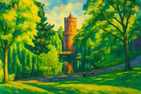 Ontdek de magie van een kleurrijk landschap waarin een majestueus kasteel omringd wordt door weelderige bomen en glinsterend water, perfect voor een betoverende ontsnapping in de natuur.