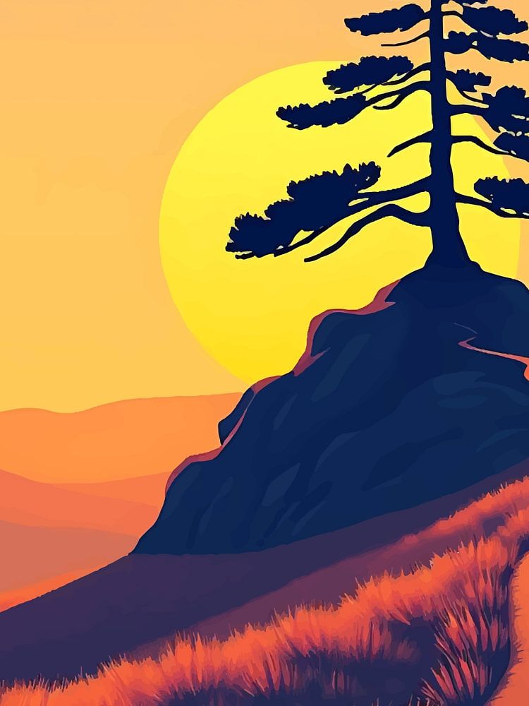 Een illustratie van een kronkelend pad op een met gras begroeide heuvel naar een eenzame, gestileerde boom in silhouet tegen een ondergaande of opkomende zon met een levendige gradiënt in de lucht.
