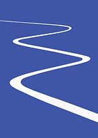 Eenvoudige abstracte illustratie van een wit pad dat door een blauw landschap kronkelt. De minimalistische benadering suggereert een reis of weg door de open ruimte.