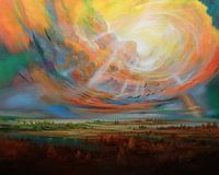 Dit olieverfschilderij maakt indruk met zijn indrukwekkende weergave van de natuur en daagt de kijker uit om de wereld om ons heen vanuit een nieuw perspectief te bekijken. De monumentale weergave van de kolkende lucht trekt onmiddellijk de aandacht en symboliseert de pure, onmetelijke kracht van de natuur. De spiralende wolken die de…