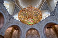 Een van de enorme en gedetailleerde versierde kroonluchters in de Sheikh Zayed-moskee in Abu Dhabi.