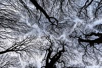 Deze foto legt het fascinerende natuurlijke patroon vast dat bekend staat als kroonschuwheid, waarbij de bovenste takken van hoge bomen elkaar niet raken en zo delicate openingen in het bladerdak vormen. Van onderaf gefotografeerd op een rustige winterdag, onthult het beeld de ingewikkelde silhouetten van kale takken tegen een bleke, bewolkte lucht. De compositie benadrukt zowel structuur als leegte - de fijne lijnen van de bomen lijken bijna op aderen of neurale netwerken die in de ruimte hangen. Ik werd aangetrokken door de abstracte schoonheid van dit fenomeen, waar terughoudendheid en verbinding in perfecte balans naast elkaar bestaan. De koele wintertinten en het zachte licht dragen bij aan het minimalistische karakter van de scène en benadrukken eerder de textuur dan de kleur. Dit beeld verandert een bekend bosgezicht in een studie van vorm en natuurlijke geometrie en herinnert ons eraan hoe de natuur zelfs in stilte ritme en orde handhaaft. Het is een stille meditatie over ruimte, samenleven en de subtiele intelligentie van bomen.
