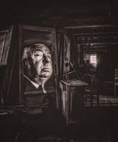 Deze foto toont het interieur van een verlaten gebouw, vastgelegd in een urbex-stijl (urban exploration), met een opvallend portret van Alfred Hitchcock. Hier zijn enkele opvallende kenmerken: