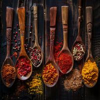 Dit indrukwekkende kunstwerk bestaat uit een serie lepels gevuld met een kleurrijke selectie specerijen. Van hete paprika tot aromatische steranijs, de levendige kleuren en texturen van de specerijen creëren een fascinerende visuele symfonie. Perfect voor fijnproevers en kookliefhebbers die een vleugje exotische specerijen aan hun…