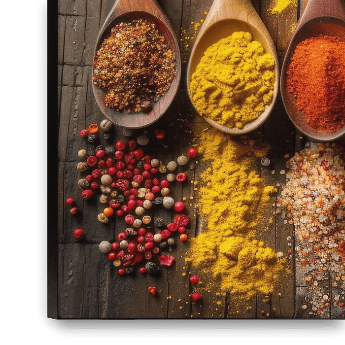 Dit indrukwekkende kunstwerk bestaat uit een serie lepels gevuld met een kleurrijke selectie specerijen. Van hete paprika tot aromatische steranijs, de levendige kleuren en texturen van de specerijen creëren een fascinerende visuele symfonie. Perfect voor fijnproevers en kookliefhebbers die een vleugje exotische specerijen aan hun…