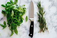 Verse kruiden in weelderig groen en een glinsterend, glanzend mes komen samen op een elegant marmeren oppervlak. Met een vleugje kookkunst en verwennerij belooft dit arrangement culinaire inspiratie en nodigt het je uit om te experimenteren. Ideaal voor in de keuken, waar smaak en creativiteit elkaar ontmoeten!