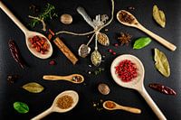 Diverse kleurrijke kruiden en specerijen met houten pollepels en vintage theelepeltjes op een stuk zwart leer. Steranijs, Chilipeper, kaneelstokjes, roze peperkorrels, kruidnagels, mosterdzaad, Costiera kruidenmix, venkelzaad, korianderzaad, vierseizoenen peperkorrels, Szechuan peper, laurierbladeren, Chiazaad, Pili-Pili, verse basillicum en verse verse tijm.