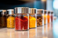 Een kleurrijk spektakel ontvouwt zich in de vorm van heldere potjes gevuld met heldere specerijen die je uitnodigen om nieuwe smaakervaringen te creëren. De warme rode en gele tinten bieden niet alleen culinaire inspiratie, maar geven de keuken ook een uitnodigende sfeer die aanzet tot experimenteren en genieten.