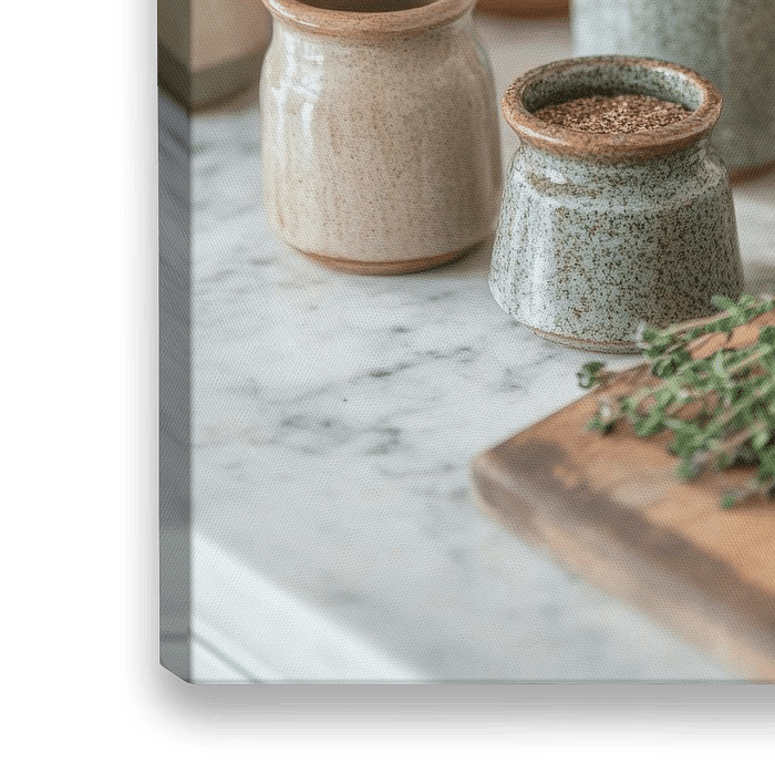 In een harmonieuze compositie van zachte aardetinten en rustieke flair komen stijlvolle kruidenpotjes en een vers bosje kruiden samen op een elegant marmeren oppervlak. Dit tafereel ontvouwt een gevoel van gezelligheid en creativiteit, ideaal voor in de keuken, waar het kan inspireren tot koken en genieten.