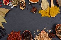 Diverse specerijen vormen een frame rond een plaat van leisteen