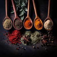 Unieke kruiden op pollepels schilderij met een prachtige stijl. Met prachtige kleurtinten en een uniek ontwerp maakt dit tot een stijlvolle fotoprint die prachtig staat in elke ruimte.