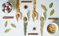 Modern kruiden palet met fraaie kleuren op wit marmer porseleinen achtergrond.