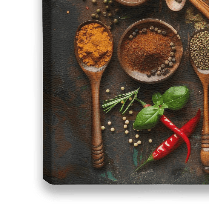 Deze artistieke afbeelding van kruiden in een harmonieus arrangement brengt de diversiteit en schoonheid van de culinaire wereld bij je thuis. Perfect voor fijnproevers en kookliefhebbers die een vleugje elegantie en kleur willen toevoegen aan hun keuken. Een stilleven dat zowel inspireert als decoreert.