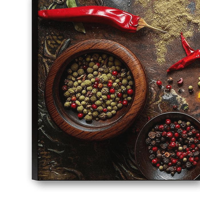 Deze artistieke afbeelding van kruiden in een harmonieus arrangement brengt de diversiteit en schoonheid van de culinaire wereld bij je thuis. Perfect voor fijnproevers en kookliefhebbers die een vleugje elegantie en kleur willen toevoegen aan hun keuken. Een stilleven dat zowel inspireert als decoreert.