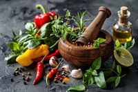 Ervaar de diversiteit van smaken met dit indrukwekkende stilleven van kruiden en specerijen. Deze kunstzinnige compositie brengt een dynamische mix van verse kruiden, hete chilipepers en kleurrijke peperkorrels rechtstreeks naar je keuken. Ideaal voor foodies en kookliefhebbers die hun huis willen opfleuren met een levendige en inspirerende decoratie. Een must-have voor elke culinaire hoek.