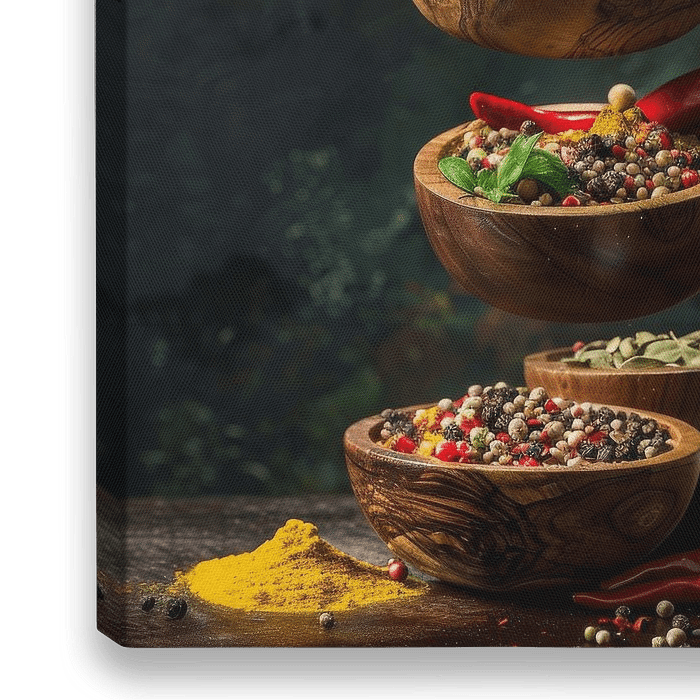 Dit levendige kunstwerk vangt de dynamiek en diversiteit van specerijen in een indrukwekkend stilleven. Vliegende peperkorrels, geurige kurkuma en verse kruiden wervelen in de lucht en creëren een boeiende compositie die de essentie van culinaire kunst viert. Ideaal voor keukenliefhebbers en fijnproevers die hun kamer willen opfleuren…
