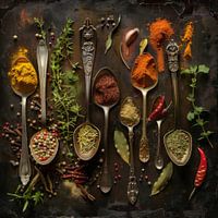 Dit indrukwekkende kunstwerk bestaat uit een serie lepels gevuld met een kleurrijke selectie specerijen. Van hete paprika tot aromatische steranijs, de levendige kleuren en texturen van de specerijen creëren een fascinerende visuele symfonie. Perfect voor fijnproevers en kookliefhebbers die een vleugje exotische specerijen aan hun keuken willen toevoegen. Een absoluut hoogtepunt voor elke ruimte die om warmte en smaak vraagt.