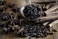 Kruiden, kruidnagel, steranijs en kaneelstokjes met houten lepel op rustieke houten ondergrond