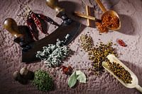 diverse specerijen met wiegemes op zandstenen achtergrond