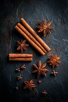 Een harmonieus samenspel van kaneelstokjes en anijsbloesems voert de zintuigen mee naar een wereld vol aromatische lekkernijen. Het warme, aardse kleurenpalet en de natuurlijke textuur van de achtergrond geven het arrangement een rustieke charme. Dit kunstwerk is ideaal voor het decoreren van de keuken of eetkamer en inspireert tot culinaire avonturen.