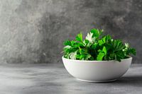 Een frisgroen talent ontvouwt zijn weelderige pracht in de witte kom. De levendige, knisperende bladeren vol vitaliteit stralen joie de vivre uit en geven elke culinaire creatie dat tikkeltje extra. Dit arrangement past perfect in een moderne keuken, waar smaak en uitstraling hand in hand gaan.