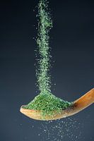 Fijngehakte gedroogde dille drijft in een levendige, bijna magische stroom in een houten lepel. De delicate kruidenvlokken dwarrelen door de lucht alsof het een groene mist is - vol leven, frisheid en smaak. De foto vangt het moment van lichtheid waarin het kruid lijkt te dansen voordat het zachtjes bezinkt.