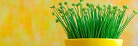 Levendig groen ontspruit uit een vrolijke, gele pot die meteen een goed humeur verspreidt. De zachte, gele kleurtinten op de achtergrond geven het tafereel een warme, uitnodigende sfeer. Dit charmante arrangement brengt een frisse wind in de keuken of eetkamer en creëert een harmonieuze, natuurlijke sfeer.