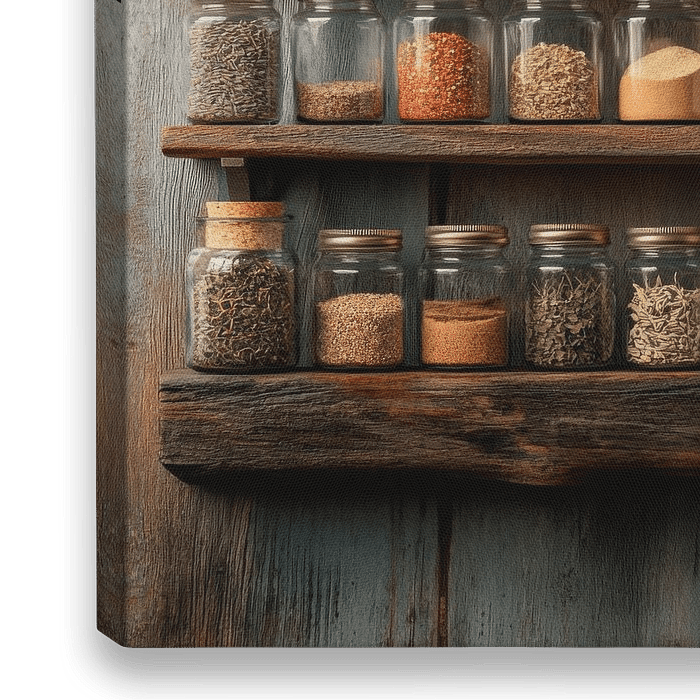 Een fascinerend schap vol specerijen die de zintuigen prikkelen en de verbeelding prikkelen. De heldere potjes met kleurrijke, aromatische inhoud creëren een uitnodigende sfeer en nodigen uit tot experimenteren in de keuken. Ideaal om culinaire creativiteit aan te moedigen en van koken een belevenis te maken.