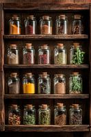 Een harmonieuze aanblik van liefdevol gerangschikte kruidenpotjes die schitteren in zachte houten frames. De heldere kleuren van de kruiden en specerijen vertellen verhalen van exotische keukens en aromatische culinaire hoogstandjes. Deze foto is perfect voor in de keuken en inspireert je om culinaire avonturen aan te gaan en je zintuigen nieuw leven in te blazen.