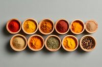 In kleine, elegante schaaltjes ontvouwt zich een harmonieus kleurenspel van verschillende kruiden. De levendige rode, gele en groene tinten geven het geheel een uitnodigende sfeer. Perfect voor in de keuken, waar culinaire inspiratie opborrelt en de zintuigen worden geprikkeld. Een waar feest voor het oog en het gehemelte!