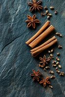 Een harmonieus samenspel van warme kaneelstokjes en exotische steranijsbloesems ontvouwt zich op een eenvoudig, elegant stenen oppervlak. De aardetinten en natuurlijke texturen nodigen uit tot dromen en koken. Dit kunstwerk brengt een aromatische en uitnodigende sfeer in elke keuken, perfect voor culinaire inspiratie en gezellige…