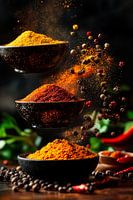 Een levendige explosie van kruiden die schitteren in zwevende schalen! De gouden, rode en oranje nuances geven het tafereel een warme, uitnodigende sfeer. Perfect voor in de keuken om een passie voor koken te benadrukken en een vleugje pit toe te voegen aan het dagelijks leven.