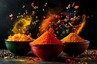 Een levendig feest van kleuren en aroma's dat de zintuigen betovert: warm rood, helder geel en aards bruin dansen in de lucht, terwijl specerijen worden losgelaten in swingende bewegingen. Deze dynamische compositie brengt leven in elke keuken en inspireert tot koken, terwijl de harmonieuze mix het verlangen wekt naar nieuwe culinaire…