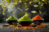 Een verleidelijk kleurenspel van heldergroen en warmoranje ontvouwt zich in stijlvolle schalen. De zwevende kruidenblaadjes geven het arrangement een dynamische elegantie. Perfect voor in de keuken, dit plaatje brengt een vleugje exotisme en creativiteit naar je culinaire avonturen. Een blikvanger die sensuele herinneringen oproept aan…