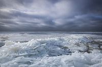 Kruiend ijs in de winter op het IJsselmeer. Als het IJsselmeer bevroren is en het gaat dooien breekt het ijs in brokken uiteen. De wind stuwd de ijsschotsen richting de kust waar hopen kruiend ijs voor mooie winterse landschappen zorgen.